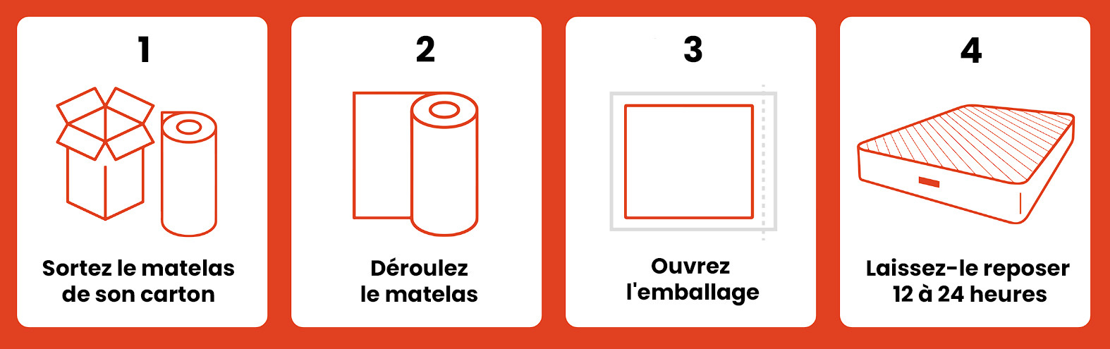 Afin de faciliter la livraison et l’accès à certains logements, ce matelas est livré compressé et roulé dans un emballage compact. Une fois l’emballage ouvert, le matelas retrouve sa taille et son volume d’origine en quelques heures.
